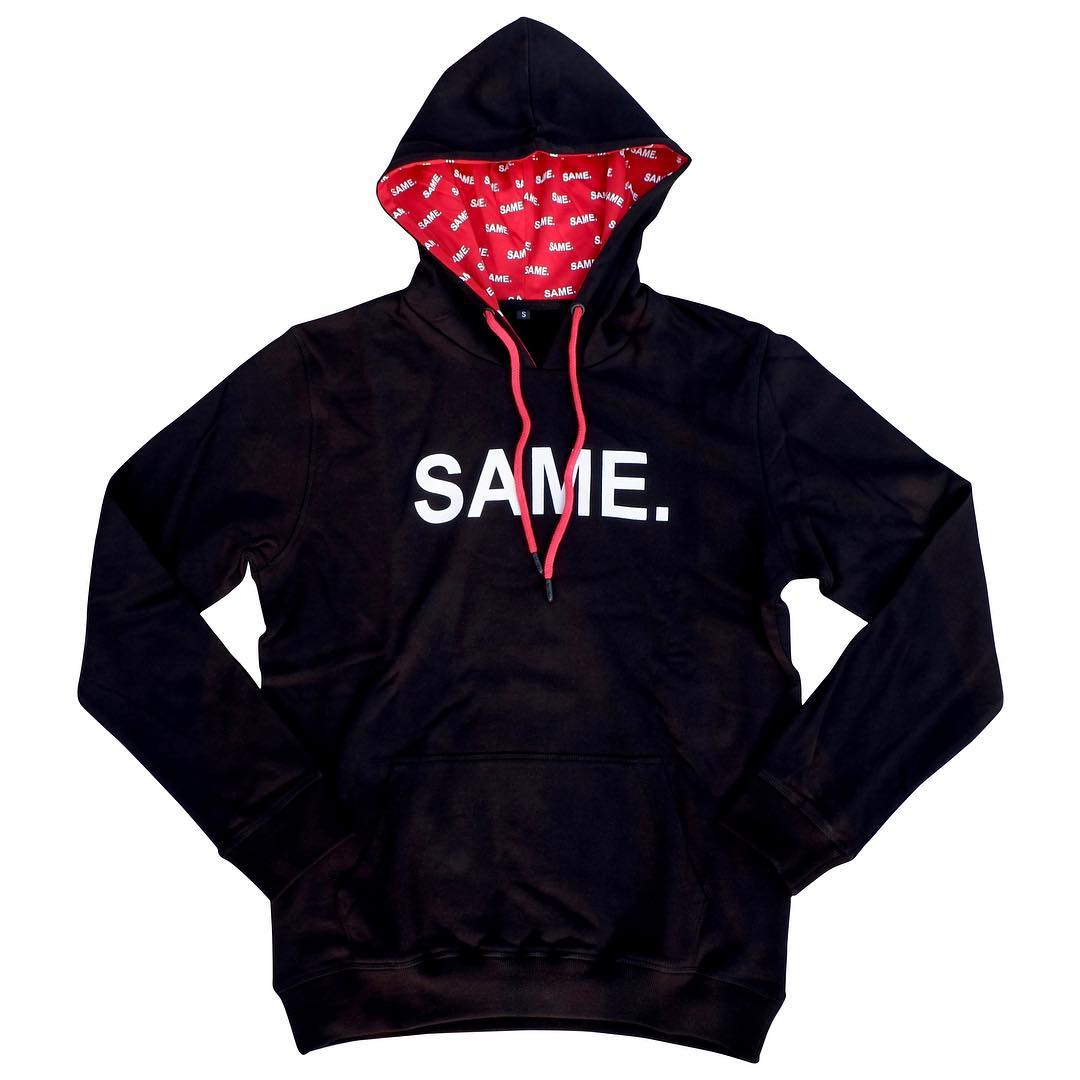 The SAME. Hoodie. Cotton/poly blend, regular fit pullover, black on the outside, red on the inside. The interior runs a repeated SAME. pattern because why not. Drawcord aglets are embossed with SAME. too
